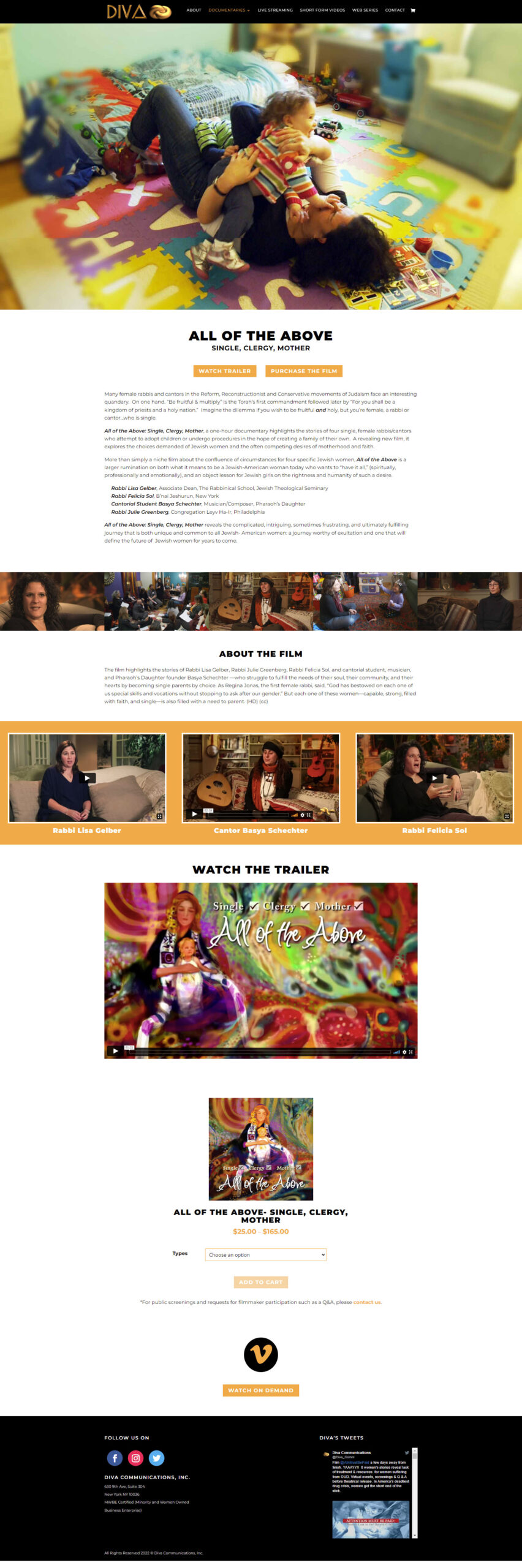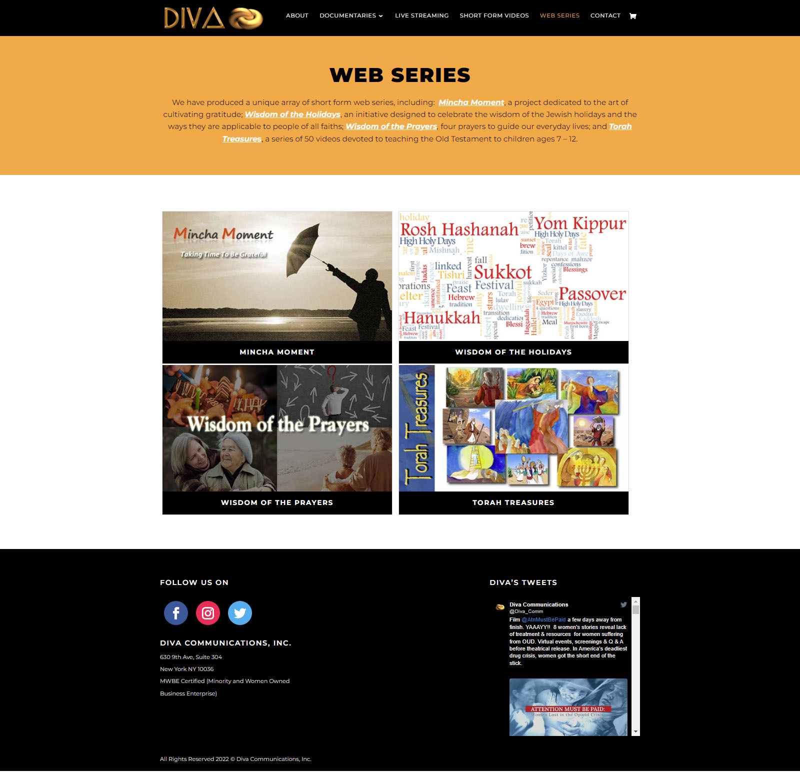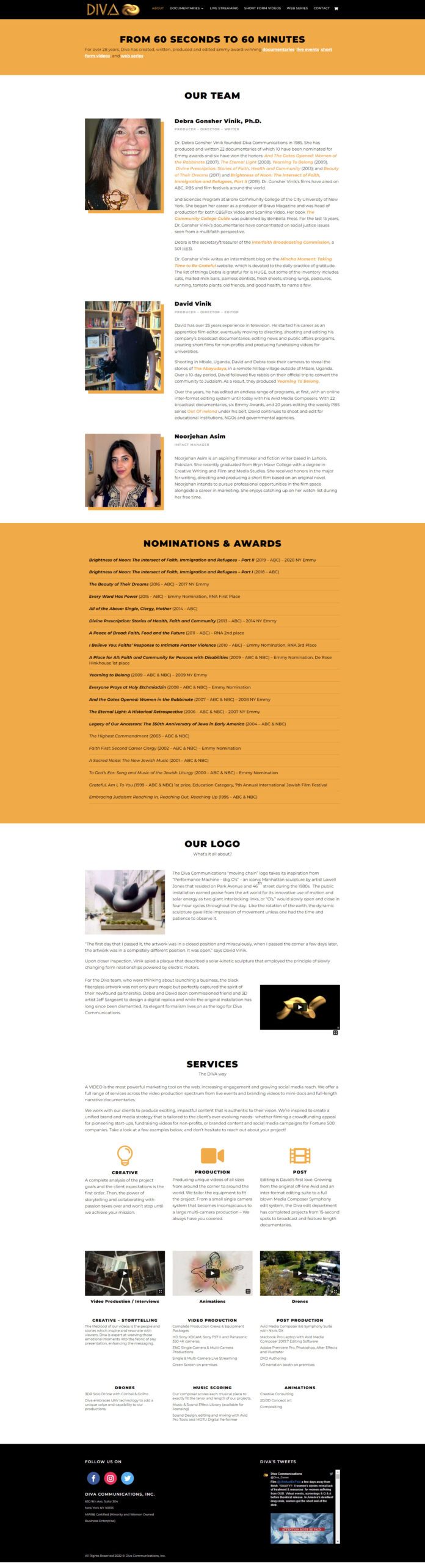 Diva Communications is a New York-based programming and production company (MWBE certified) specializing in social justice documentaries and new media projects from a multifaith perspective. Their new website provides the opportunity to view their production – documentary film trailers, short form videos and web series. There is also a live streaming section and Woocommerce built merchandise section.