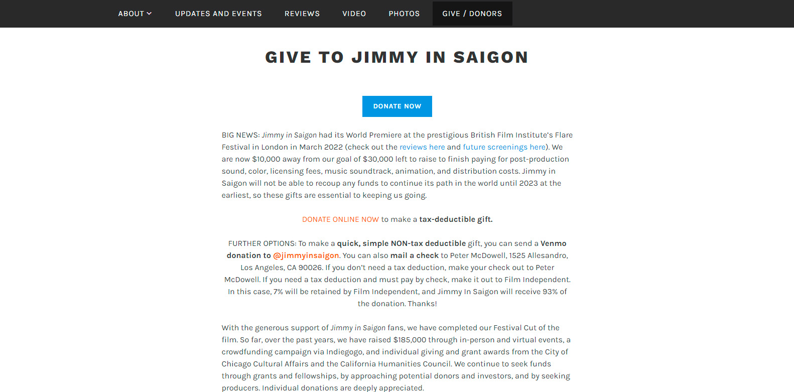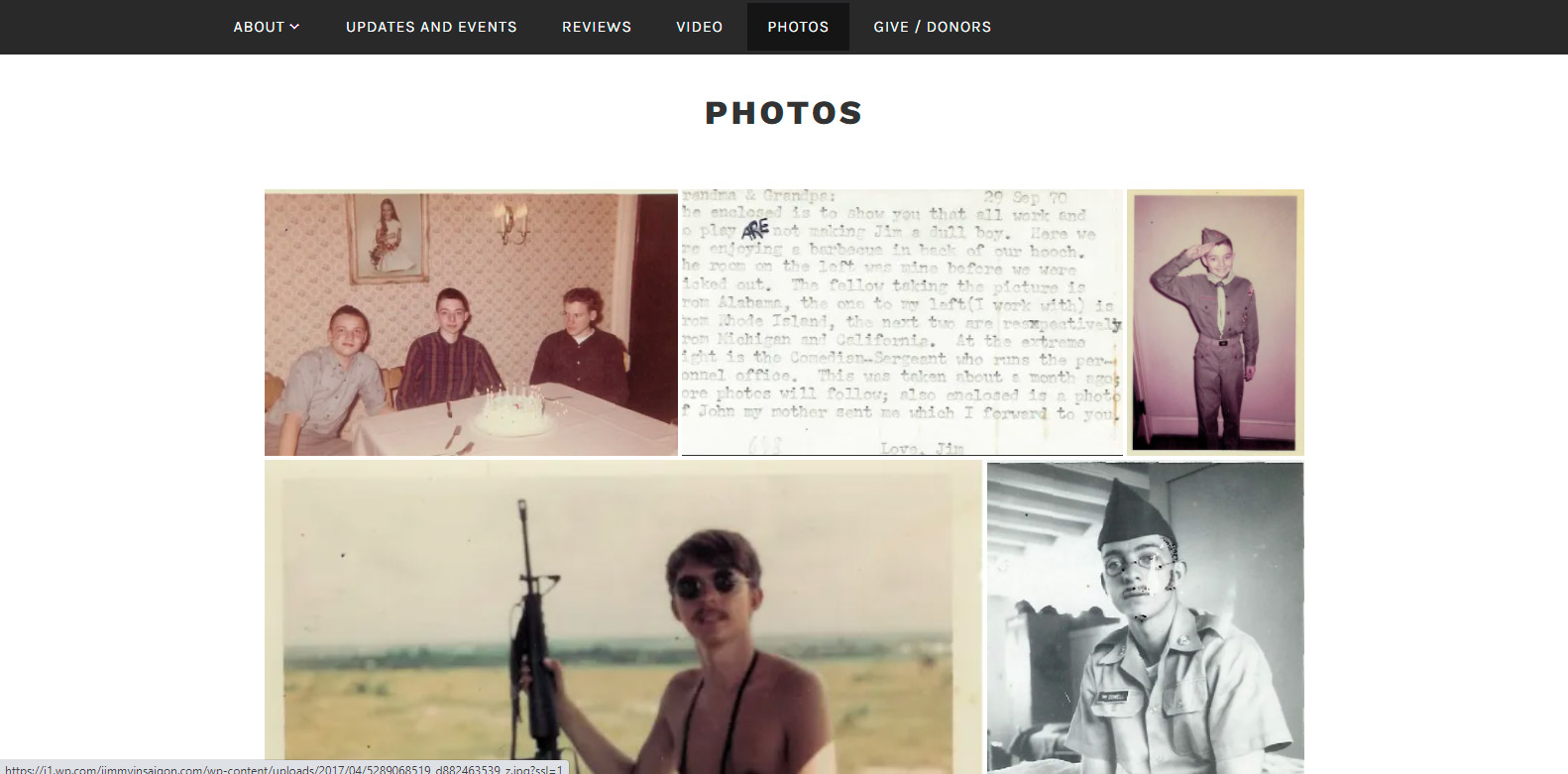 Jimmy in Saigon is a feature documentary by Los Angeles-based filmmaker Peter McDowell and executive producer Dan Savage. Originally from Illinois, Peter chronicles the story of Jim, his eldest brother, and a Vietnam War veteran. The website presents the film by various video, photo materials and reviews.