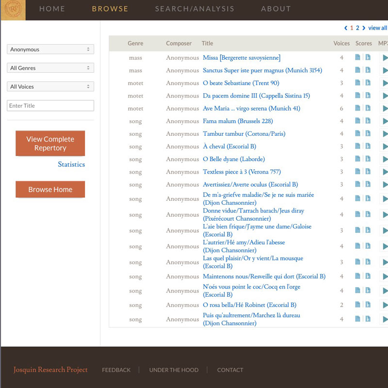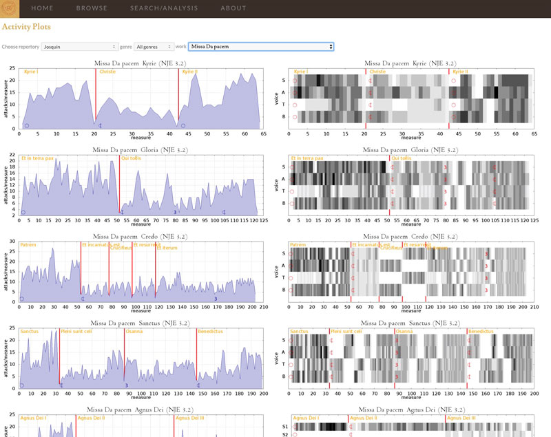 The goal of the Josquin Research Project is to facilitate a new kind of knowing that brings “big data” into conversation with traditional analytical methods — a new way to engage with Renaissance music. For the first time this music is fully searchable: in a few clicks you can identify every instance of a given melodic and/or rhythmic pattern. The JRP also provides analytical tools that can be used to gain insight into individual works, the style of a given composer, or the musical lingua franca.