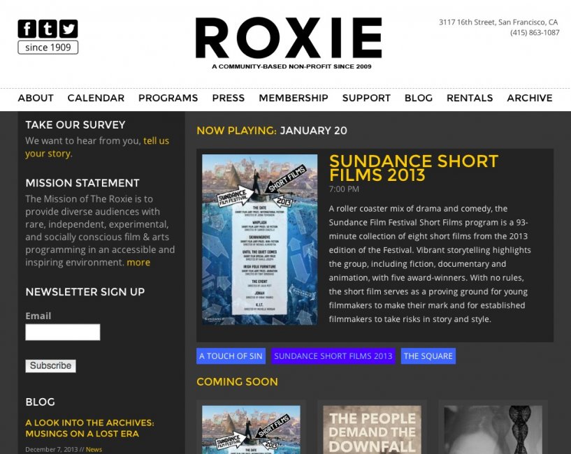 Ari Salomon of PerformSites rebuilt the Roxie site to be a fully integrated event platform where movies are dynamically displayed based on showtimes. The mobile-friendly site delivers just-in-time listings and has a variety of ways of pulling featured and archive content to the foreground.
